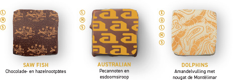 Assortiment bonbons. Ingrediënten: suiker, cacaoboter, AMANDELEN, cacaomassa, volle MELKpoeder, ROOM, glucosestroop, HAZELNOTEN, invertsuikerstroop, MACADAMIANOTEN, MELKpoeder, ROOMboter, PECANNOTEN, TARWEzetmeel, cacaobonen, TARWEmeel, WEIpoeder (MELK), plantaardige oliën en vetten (zonnebloem, koolzaad, kokos), PISTACHENOTEN, magere MELKpoeder, cacaopoeder, koffie, gekarameliseerde suikerstroop, karamel, MELKvet, LACTOSE (MELK), honing, MELKEIWIT, dextrose, maltodextrine, aardappelzetmeel, KIPPENEIWIT, GERSTENmoutextract, emulgatoren (SOJAlecithine, zonnebloemlecithine), natuurlijk vanille-aroma, aroma (vanille), kaneel, stabilisator (E1103, E420), verdikkingsmiddel (E407), destillaat van dennen en kersen (60% vol), zout, rijsmiddel (E500), antiklontermiddel (E535), kleurstoffen (E172, E150a, E150d), ethanol.